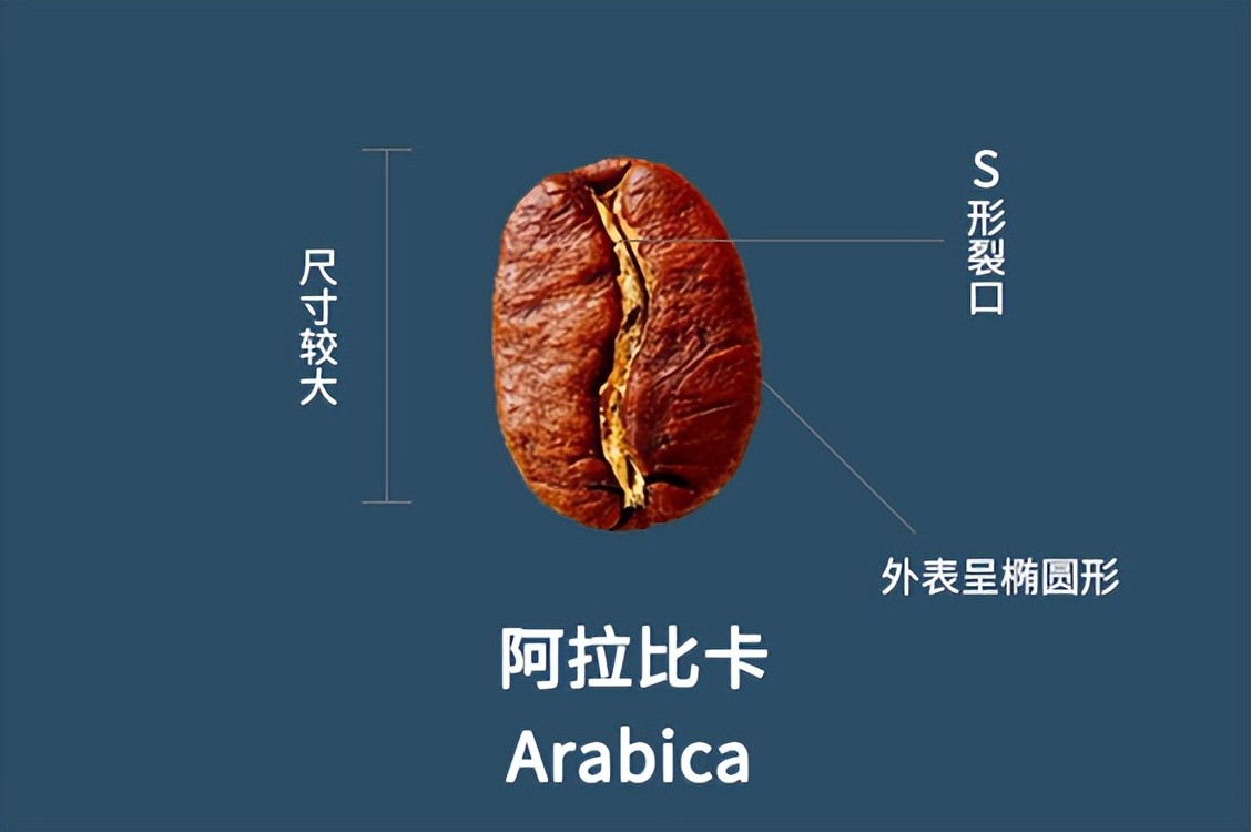 阿拉比卡咖啡豆的尺寸较大,生豆颜色为深绿色,呈椭圆形,表面有典型的S形裂口。阿拉比卡豆具有特殊的风味,有巧克力、焦糖、坚果风味,还有果酸味。