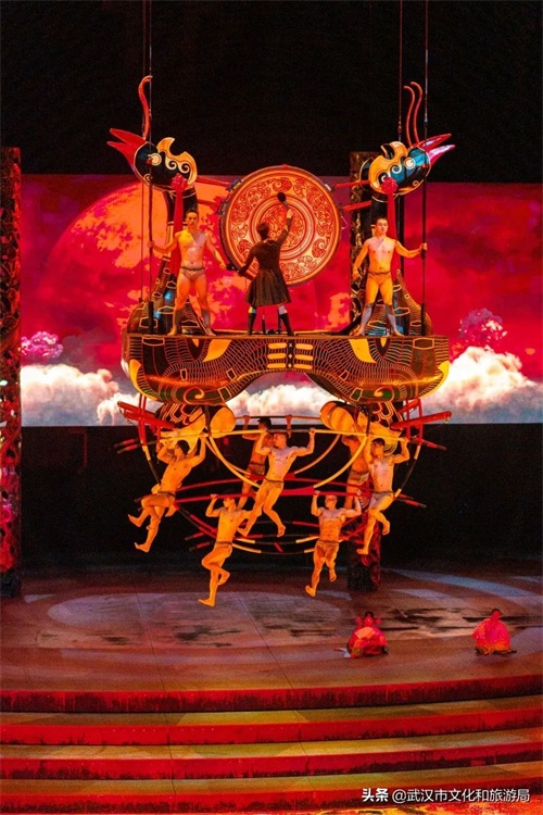 从天而降的虎座鸟架鼓上,几位演员跟随鼓声节奏变换多个不同动作;