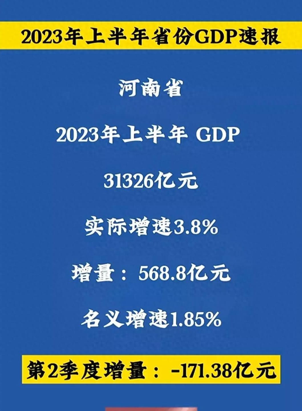 河南省2023年上半年GDP增量相对拉胯,名义增速仅为1.85%,增量为568.8亿元,二季度更是出现了-171.38亿元的负增长。