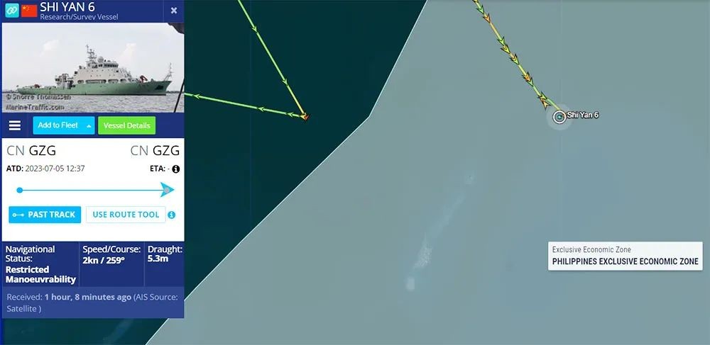 7月13日,根据AMTI使用船舶自动识别系统(AIS)显示,中国一艘3000吨级的科考船抵达了礼乐滩,这艘科考船就是中国“实验6”号科考船。