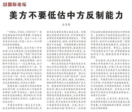 这篇文章虽然被放在了第三版,但是还是引起了广泛的关注。在文章之中出现了一句非常重要的词语,“勿谓言之不预”。文章中指出,中美两国的产业是高度融合,并不是哪一方单方面依靠,两方的贸易有着极高的互补性。中国有关部门更是指出,“合则两利,斗则俱伤,贸易战是没有赢家的,中方在此奉劝美方不要低估中方维护自身发展的能力,勿谓言之不预”