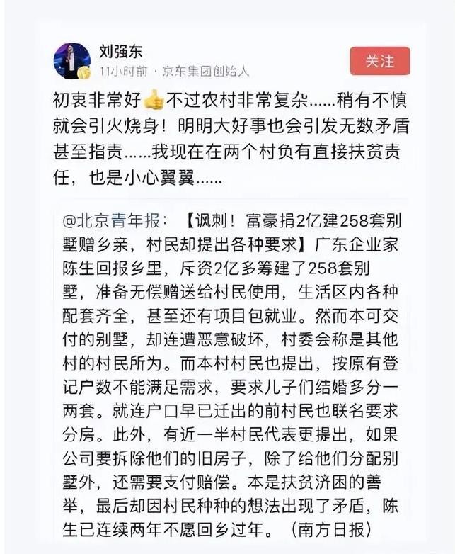 这些事情让陈生颇感无奈,最后甚至闹上了新闻,曾经历过类似事情的刘强东就表示:“农村非常复杂,稍有不慎就会引火烧身...”