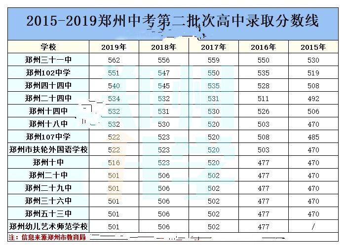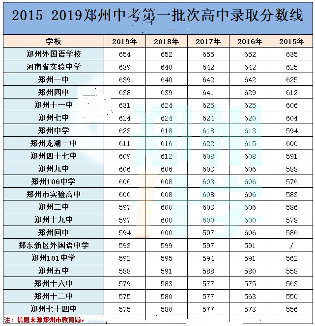 下面是2015-2019年的郑州市第一、二、三批次高中录取分数线。