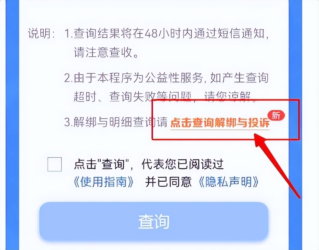 如果发现可疑的账号,或者想解绑手机号,可以如下操作。点击》》查询解绑与投诉,即可解绑该APP的手机号。
