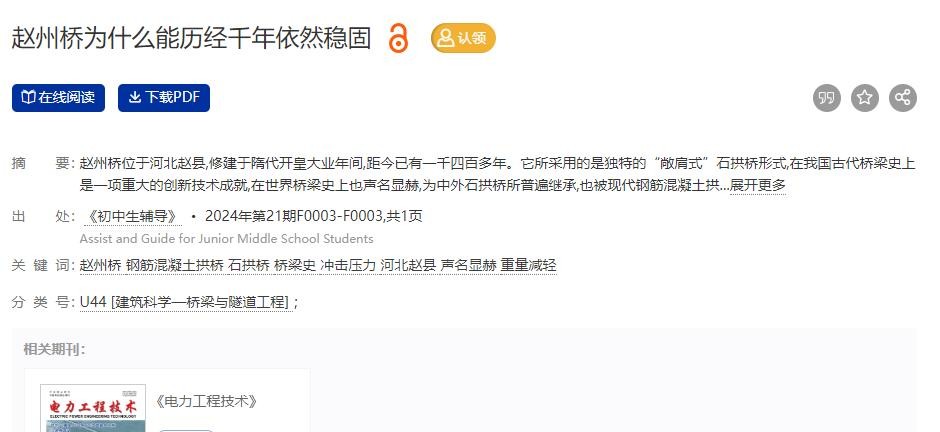 参考资料:[1]赵州桥为什么能历经千年依然稳固[J].初中生辅导,2024(21):F0003