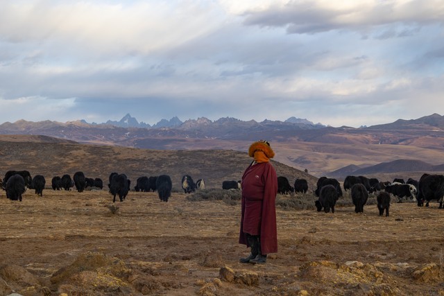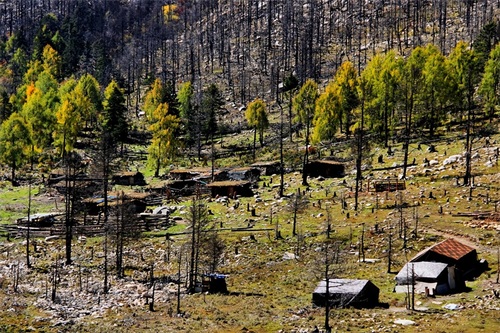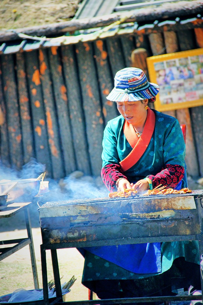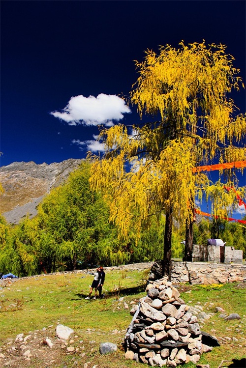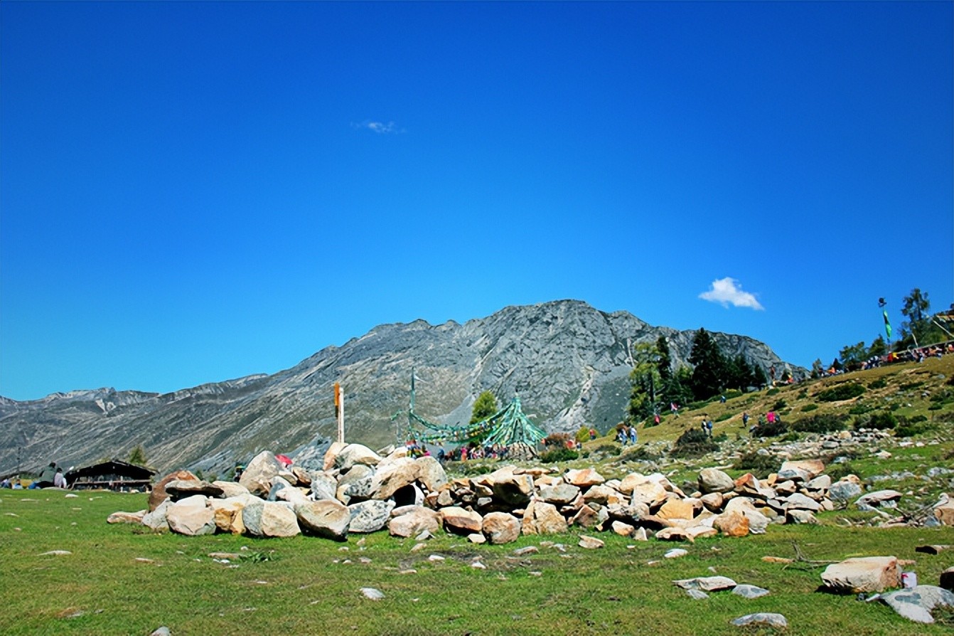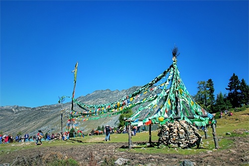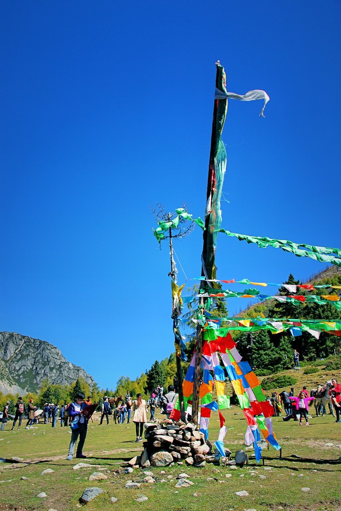 白海草原,在这里有祈祷的美丽经幡、承载无数春秋的玛尼堆,虽然自己不懂这些深层次的含义但每次都会被人们的虔诚或信仰所打动,记得之前曾听藏家人说:经幡作为福运升腾的象征物每年都要换新,换新的日子不能随意选择,它是根据藏族历算,选择在藏历新年初一过后某一个良辰吉日。这一天早上,全院的人都穿上节日盛装,聚集在楼顶上,举行一次隆重而欢乐的插经幡仪式,藏语里这个仪式称为“托随”,意为祭神祈福仪式。而玛尼堆玛尼堆没有固定的形状,呈方形或椭圆形,也有墙形或塔状的。它们都有一个正面,通常向东,因为面朝太阳象征着吉祥......本以为只有深秋时银杏树叶的金黄非常的美丽,没想到在这却有如此惊艳的金黄的松树叶;草原经幡旁有臧家牦牛肉可谓色香味俱全,2元每串有时间或此爱好的可以尝尝。