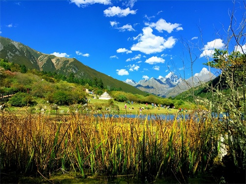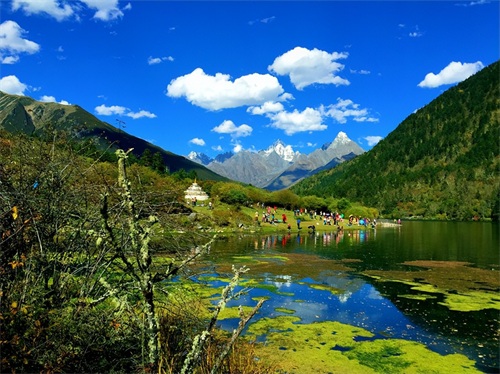 木格措坐落于贡嘎山脉中段,距康定城约17公里,由黄金海岸、白海草原、溜溜山、七色海、药池沸泉等景点组成,附近有多个高山湖泊和温泉,其原始森林、草原和雪山景观互相交融。
