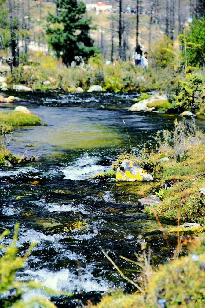 七色海,海拔2600m,是一处湖水与温泉交融的高原湖泊,湖面呈月牙形,周围由森林、草甸环绕,清雅幽静,湖水清澈透明,随阳光天气变化湖水色调呈七色变化,七色海因之得名,此次过来有幸见到靠湖边水面有地下温泉溢出,用手尝试为温热;远处雪山影绕湖面,呈现别样的湖光山色,真是大自然的巧夺天工。