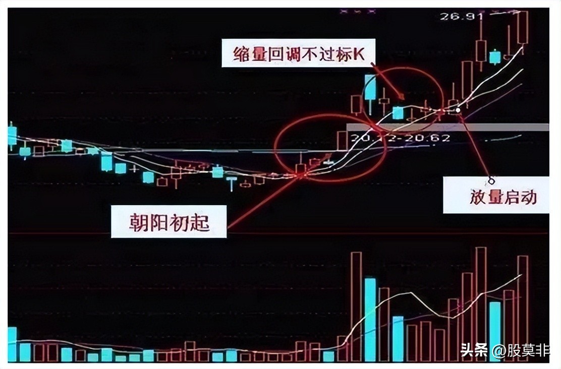 此种形态应该理解为一浪放量上升二浪缩量回调不破标志性K线,再次放量起来走主升浪的概率很大。如下图: