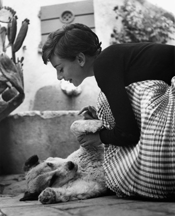怀里抱的小鹿应该就是赫本在出演电影《翠谷香魂》时收养的那只梅花鹿,她给它取名叫依比。依比长大后与赫本形影不离。