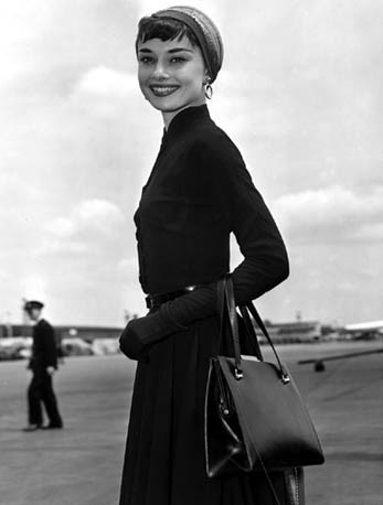 典型的“赫本风”,黑色裙子,眉上刘海,搭配一条头巾,放在现在也很潮流。