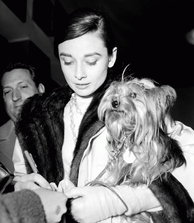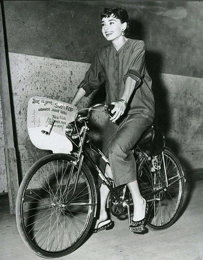 梳着中分短发的赫本多了一分男孩子的帅气。自行车篮子里的狗狗应该很幸福吧,毕竟赫本是个那么善良的人,又喜欢小动物,跟她在一起一定会被善待。