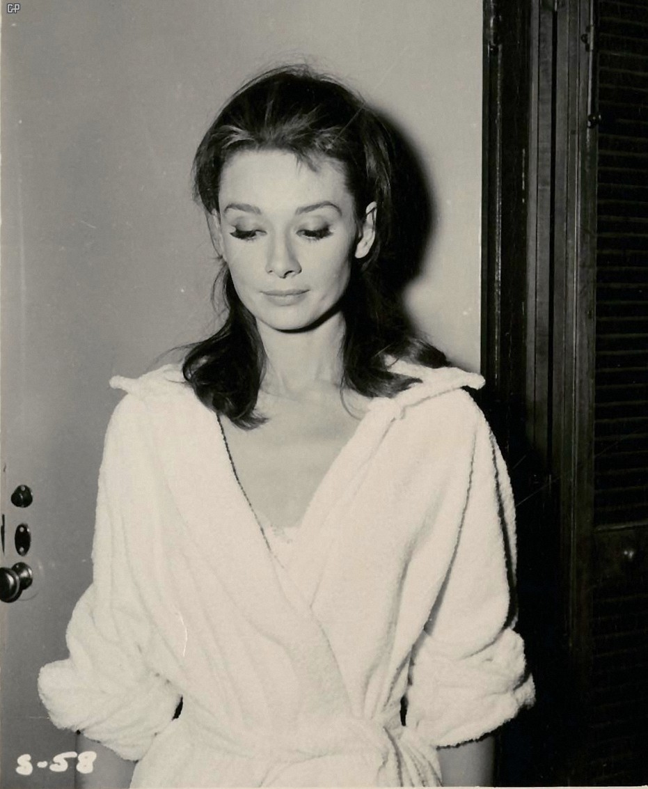 浴袍加身,头发很自然地披在肩上,只是不知道有没有人像我一下好奇,赫本的睫毛是真的吗?
