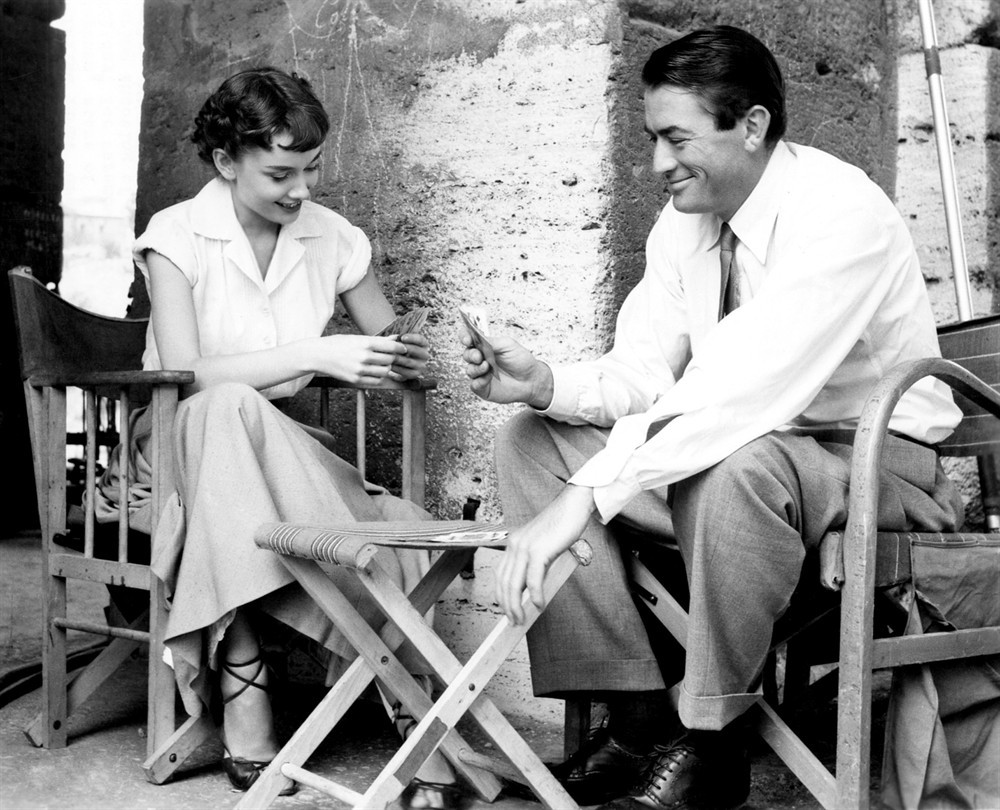 看赫本穿的衣服,应该是在拍摄《罗马假日》的现场,两个主角竟然在打扑克牌,这打发时间的方式挺有趣啊,那个时候还没有手机,打扑克牌想必很流行吧。