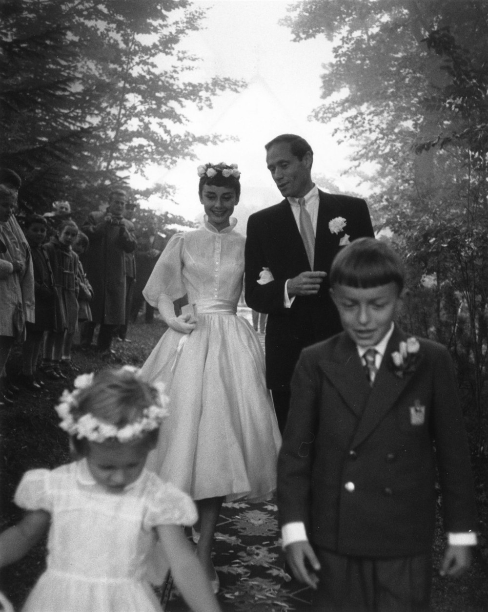 赫本与第一任丈夫结婚时的照片,头上戴着花环,没有头纱,但礼服很漂亮。
