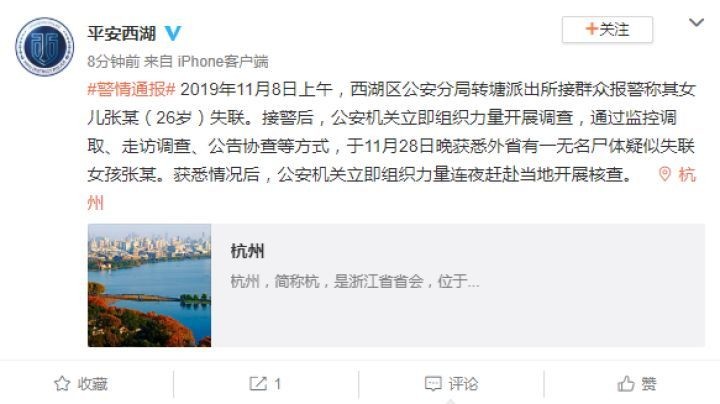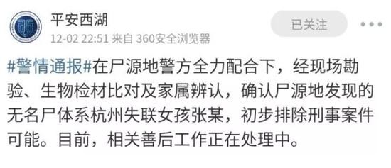 昨天晚上22点51分,“平安西湖”发布通报:在尸源地警方全力配合下,经现场勘验、生物检材比对及家属辨认,确认尸源地发现的无名尸体系杭州失联女孩张某,初步排除刑事案件可能。目前,相关善后工作正在处理中。