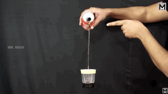 这个魔术可以变给小宝宝看,特别好玩,纸杯全程“悬空”,还不断有可乐倒入!其实可乐罐和纸杯之间有一根细线相连。