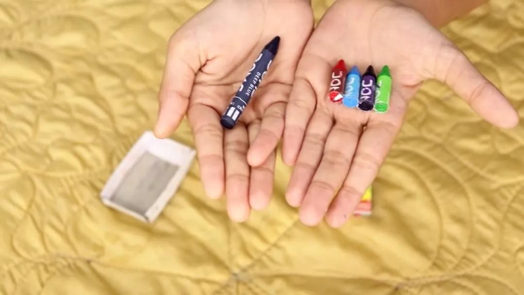 这个魔术看上去很炫酷,其实特别简单,诀窍在按住蜡笔盒的手指和只有半截的蜡笔上,孩子也能分分钟学会。