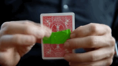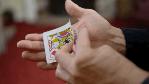 你只需要在纸牌后面贴一张可卷曲的塑料卡片,再把卡片的两端粘在你的手掌上就行。慢慢卷曲手掌,再张开手掌,纸牌就会向前、向后移动了,要想效果更真实,动作一定要慢!!!