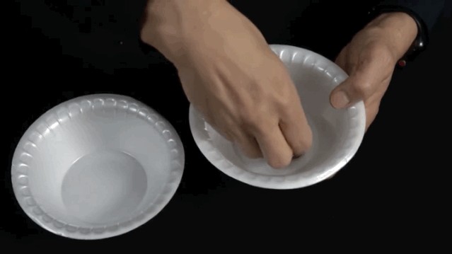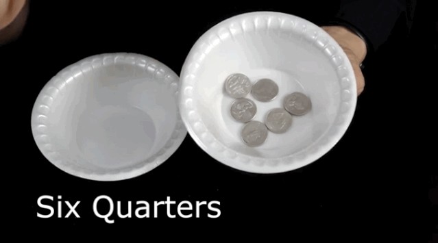秘诀在于有3枚硬币是事先粘在纸盘底部的,加入另3枚散装硬币翻转3次,无论怎么翻转,被揭开的盘子里都会出现那3枚散装硬币,而被固定的3枚硬币这时被倒扣在另一个纸盘里,零失败率!