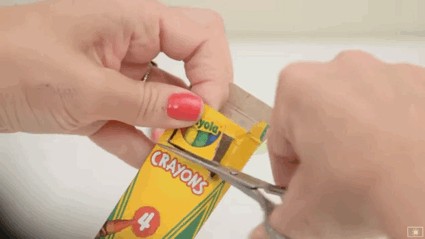 制作道具只要5分钟。我们需要先给蜡笔盒剪一扇“小窗户”,然后用胶带把蜡笔绑在一起,再用刀切掉半截蜡笔(这步请大人操作!),把笔放入蜡笔盒里就大功告成啦。