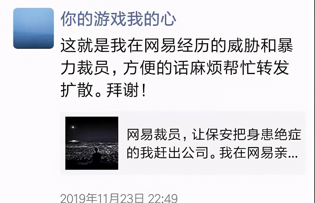 2019年11月的时候,一个在网易工作了5年的员工在社交媒体上发了一篇文章,《网易裁员,让保安把身患绝症的我赶出公司,我在网易亲身经历的噩梦》