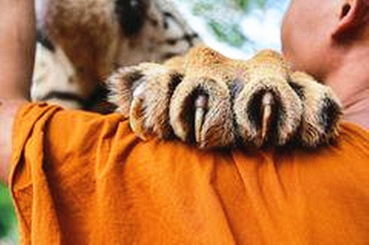 老虎将爪子放在人的肩上