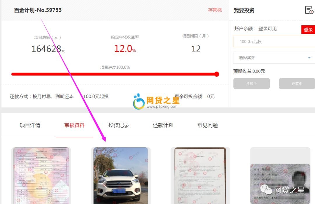 抵押车疑为同一辆,但借款人的身份信息不同,《网贷之星》报道中的图片显示,百金计划60067的借款人是80后男子,而百金计划59733的借款人生于70年代。