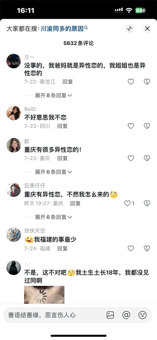 要说川渝地区为何同性恋较多,可能跟地区文化有关。川渝地区的文化具有一定的开放性和包容性,人们对不同的生活方式和个人选择较为尊重,这使得同性恋者在当地可能更容易公开自己的性取向。而且社会观念较为开放,川渝地区的人们普遍不太爱干涉他人的事,对各种现象往往能泰然处之,基本保持“关我屁事”的原则。这种相对宽松的社会氛围,为同性恋者提供了更自由的生存空间。还有就是川渝地区人口基数大,这导致了绝对数量占领了优势,可能以同性恋人口占比来统计,川渝地区的排名或许有些改善。你觉得川渝地区同性恋多吗?#同性恋##川渝地区#