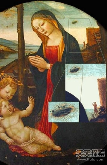 12. 这张画像的重点当然是中间的圣母玛莉亚,但是如果仔细看就能看到她的左肩上有一个不明物体,放大后的影像看起来似乎有点像UFO,而左后方也能看到一名男子以及他的狗正抬头看着这个盘状物体。