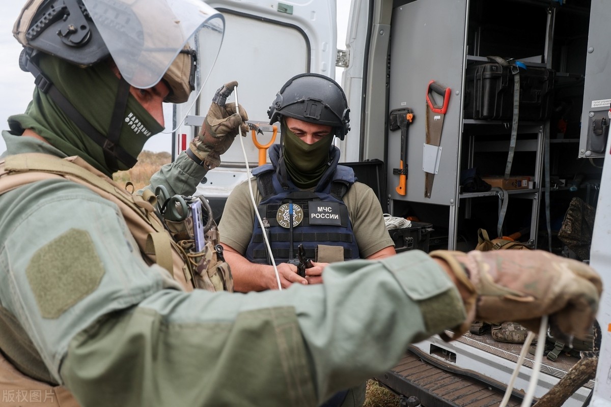 当地时间2024年10月7日,俄罗斯库尔斯克州,俄罗斯排雷小组成员正对爆炸物进行搜寻清理工作。