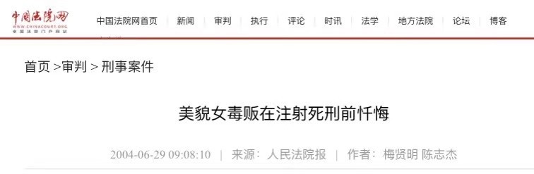 中国法院网 《美貌女毒贩在注射死刑前忏悔》2004-06-2909:08:10来源:人民法院报 作者:梅贤明 陈志杰