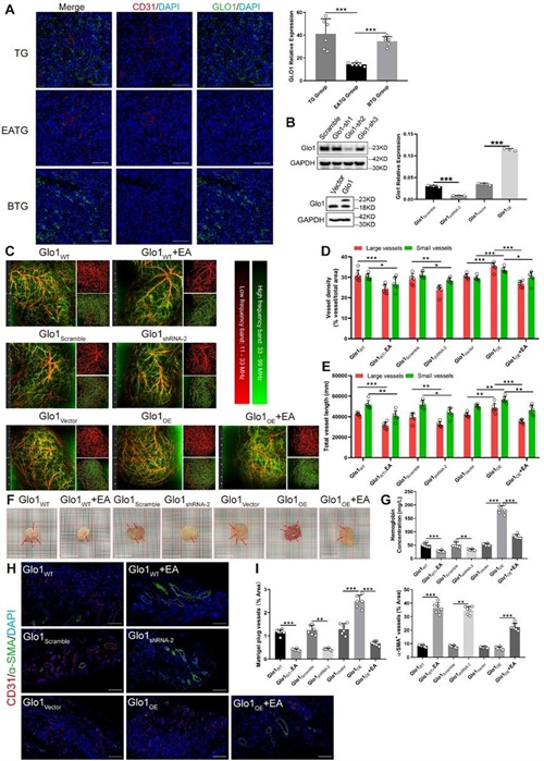 研究者进一步通过药物抑制和基因沉默两个维度从细胞水平探索并验证了GLO1下调对内皮细胞血管生成的抑制作用,并且通过斑马鱼在体水平的GLO1沉默技术,充分验证了GLO1下调对整体脉管系统的抑制作用。