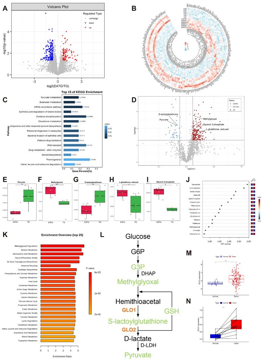 进一步,研究者通过DIA蛋白组学联合非靶向代谢组筛选出针刺促乳腺癌移植瘤血管正常化的关键途径之一:甲基乙二醛降解途径,该途径为糖酵解过程中的分支,其中乙二醛酶1(GLO1)是针刺作用的关键效应靶点。