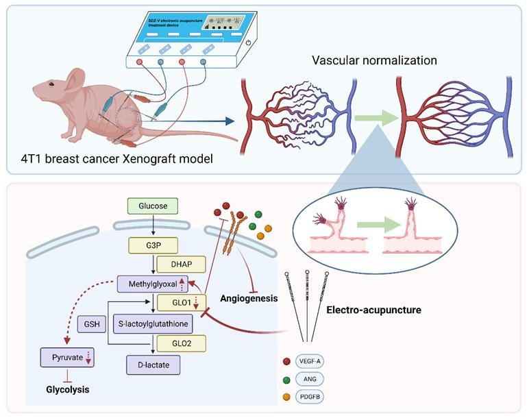 北京中医药大学第三附属医院针灸微创肿瘤科黄金昶教授团队一直致力于肿瘤器官保留研究,着力点在针刺化疗增效。其科研团队最新研究发现,中国传统针刺疗法显著促三阴性乳腺癌血管正常化,并在效应时间窗内协同化疗增效。而且源于传统电针针刺,发现调控内皮细胞抗肿瘤血管生成的新靶点GLO1。此为团队临床针刺联合化疗增效的创新模式提供了坚实理论支撑。该科研成果有望为中西医结合肿瘤诊疗模式提供新方向和新手段。