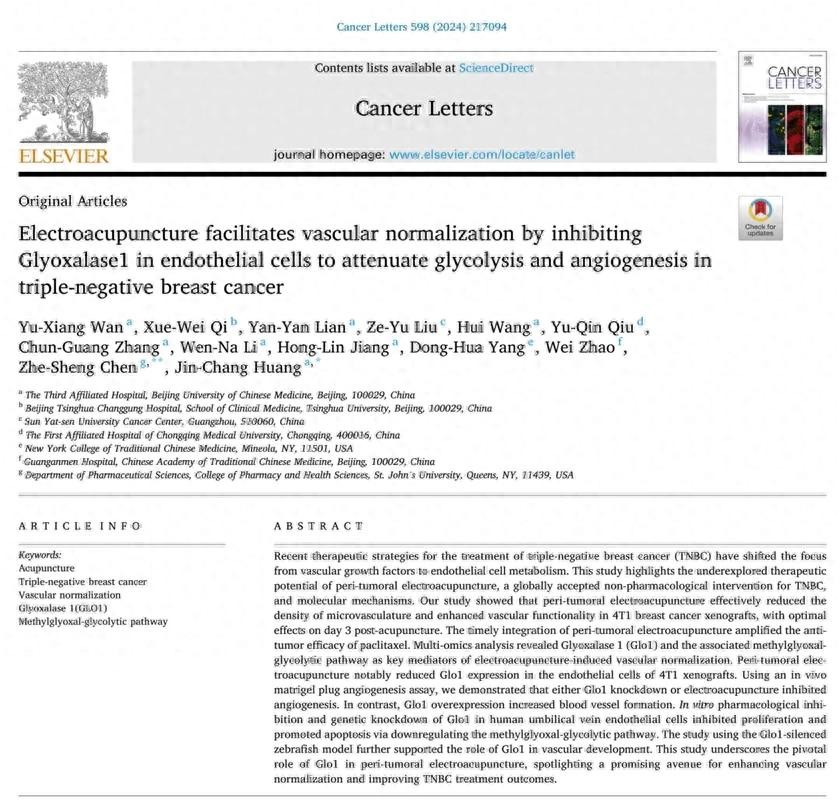 Cancer Letters杂志(IF=9.1,中科院一区TOP期刊)2024年6月29日在线发表北京中医药大学针灸肿瘤研究所黄金昶教授与美国圣约翰大学陈哲生教授为通讯作者、万宇翔助理研究员为第一作者,题为“Electroacupuncture facilitates vascular normalization by inhibiting Glyoxalase1 in endothelial cells to attenuate glycolysis and angiogenesis in triple-negative breast cancer” 的研究论文,详细介绍了该科研成果。