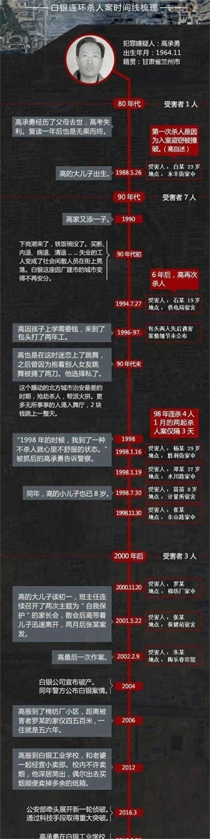 2016年8月26日,白银市公安局在白银市北郊工业学校的学生服务部(小卖部)里抓走了52岁的男店主高承勇。从1988年5月26日到2016年8月26日,背负 11 宗命案,藏匿了 28 年的连环杀手最终落入法网。被民间列为“建国以来十大悬案”之首的“甘蒙'8·05’系列强奸杀人残害女性案”(即白银案)告破。