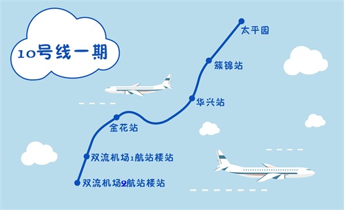 10号线一期是成都地铁首条机场专线,线路起于太平园站,止于机场T2航站楼,线路全长10.9km,全段为地下线,共设地下车站6座,由北向南依次站点为:太平园站、簇锦站、华兴站、金花站、双流机场1航站楼站、双流机场2航站楼站。