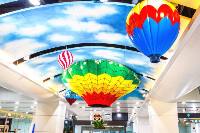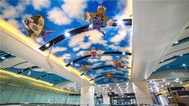 双流机场1航站楼站给人惊喜的地方在于,在车站公共艺术设置方面突破以往传统墙面壁画形式,就是大家常见的主题文化墙,这次在站厅楼梯位置天花吊顶做“装置艺术”作品,内容以“飞翔”主题展示蓝天白云、飘扬气球、放飞纸鸢等素材,立体、形象的契合了装修的整体空间效果,浑然一体、美轮美奂,不仅让历史文脉得以延续,更寓意着“吉祥平安、腾飞顺达”的美好愿景,完美定义10号线装修设计的独到之处。