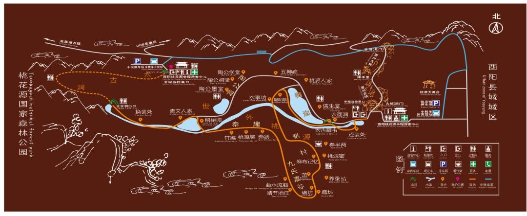 太古洞 洞体分布于酉阳县城桃花源景区西侧的金银山森林公园山体内,形成于二叠纪时代,距今已经有三亿年的历史,全长约3000米。洞内冬暖夏凉,温度在14~17℃之间。洞府体量庞大,有宽敞的大厅、曲折的廊道、险峻的峡谷、幽深的地下河、五彩缤纷的钟乳石,被誉为地下“世外桃源”。