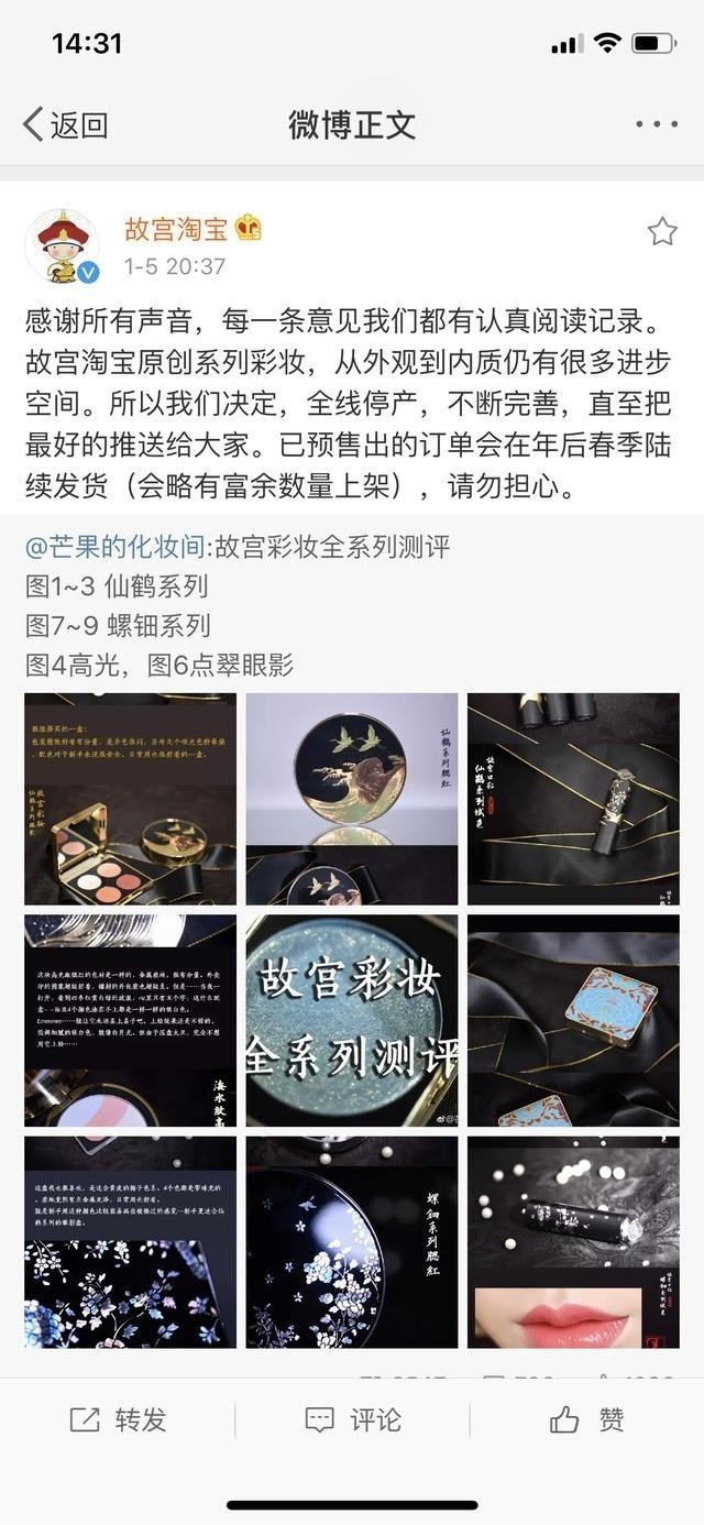 故宫淘宝表示,“感谢所有声音,每一条意见我们都有认真阅读记录。故宫淘宝原创系列彩妆,从外观到内质仍有很多进步空间。所以我们决定,全线停产,不断完善,直至把最好的推送给大家。”