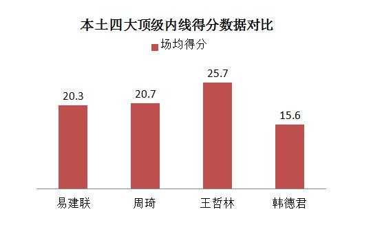 本赛季韩德君场均能够贡献15.6分,排在了国内球员当中的第12位,这样的得分在和同位置的易建联、周琦、王哲林等球员相比还是有一定差距的。王哲林场均能够贡献25.7分、周琦20.7分、易建联20.3分,通过与国内同位置球员对比可以发现,韩德君的得分并不是太高。