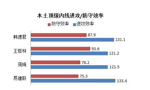 在进攻效率方面上韩德君的确可以用出类拔萃来形容,在和本土同位置球员对比中,也仅比易建联的133.4的进攻效率稍差一些,而比周琦的121.5的进攻效率和王哲林121.2的进攻效率要高出很多,也看得出来韩德君在进攻方面上的确要好于更加年轻的周琦和王哲林。