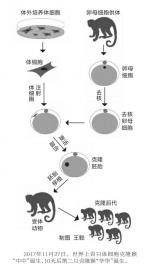 “中中”和“华华”“姐妹”俩的基因,来自同一个流产的雌性猕猴胎儿。科研人员提取了这个猕猴胎儿的部分体细胞,将其细胞核“植入”若干个“摘除”了细胞核的卵细胞,结果产生了基因完全相同的后代,这个过程也就是克隆。