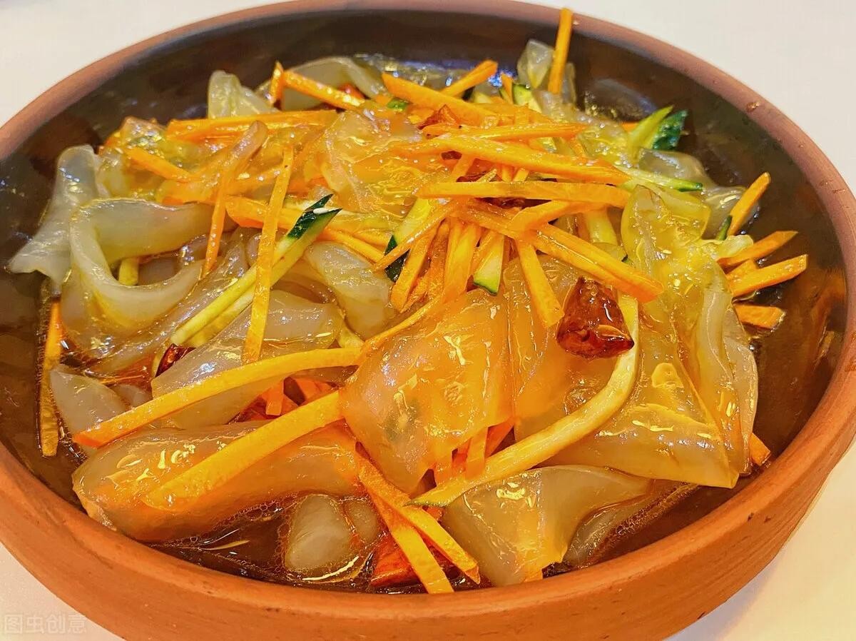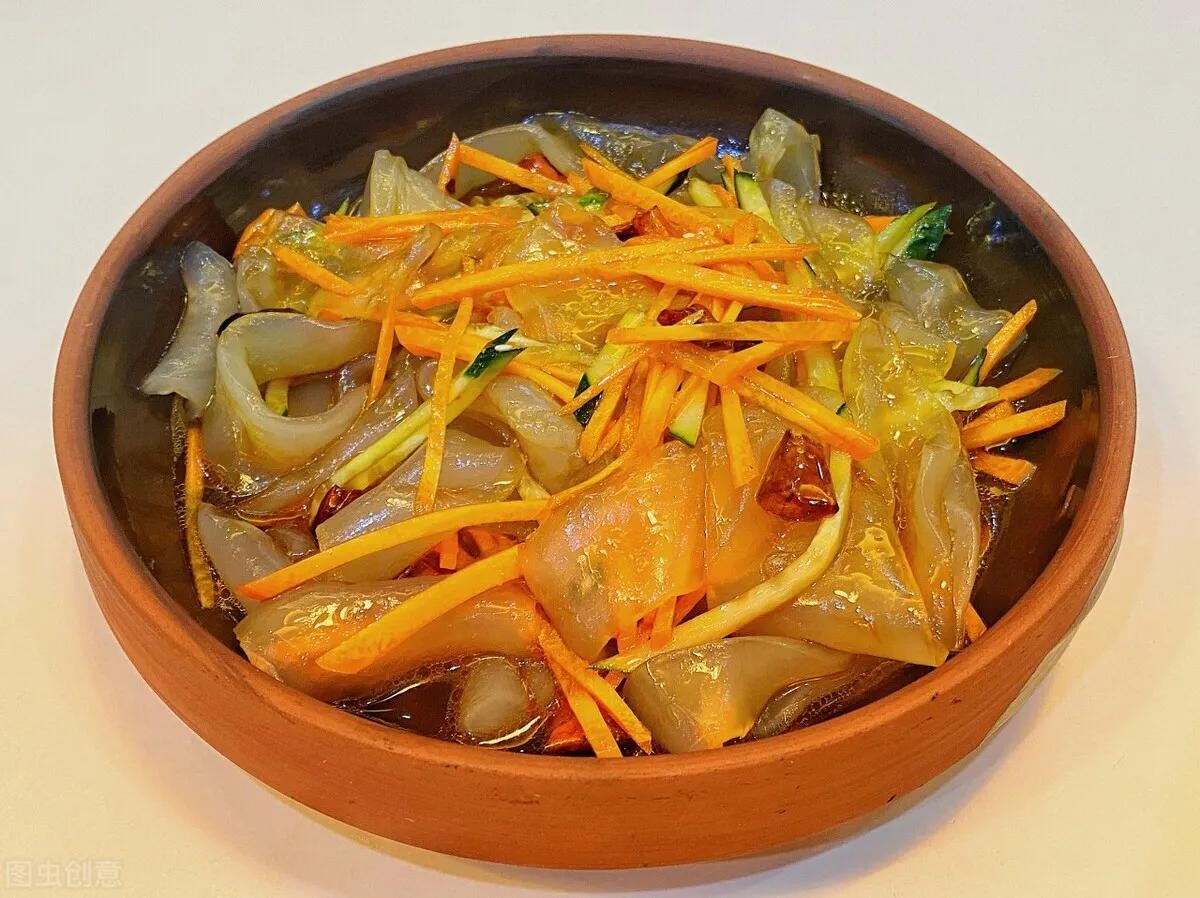 《食材》东北拉皮、胡萝卜、黄瓜、盐、大蒜、辣椒面、生抽、糖、鸡精