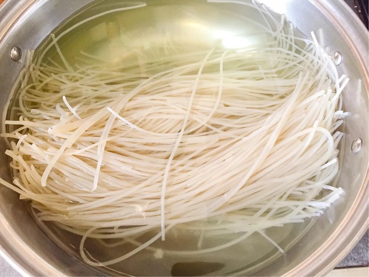 1、这是我提前泡好的粉丝,锅中烧水,放点油,盐,再放进粉丝煮熟