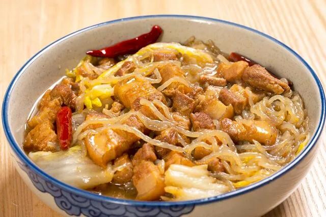 《食材》五花肉300克、粉条1把、白菜、盐、老抽、干辣椒3个、葱、姜、味精