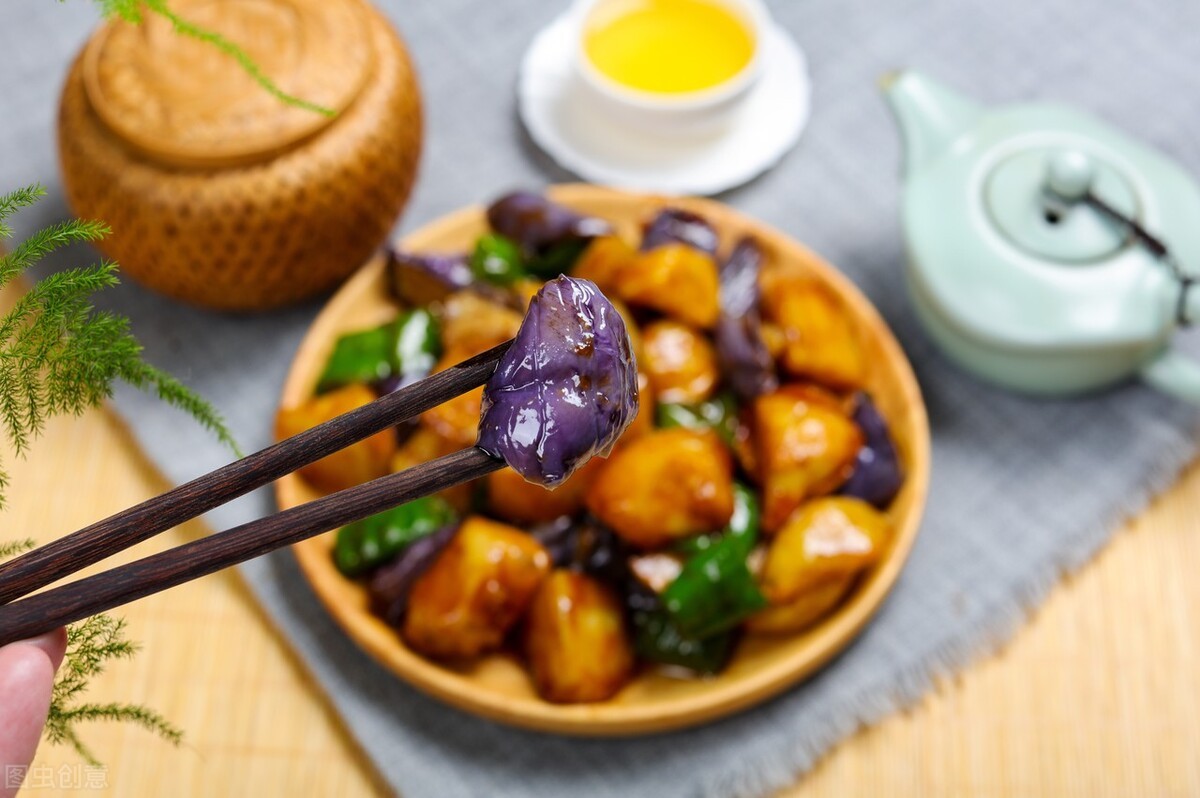 《食材》土豆1个、紫长茄1个、青椒1个、大蒜、葱姜、盐、鸡粉、糖、水淀粉、老抽少许