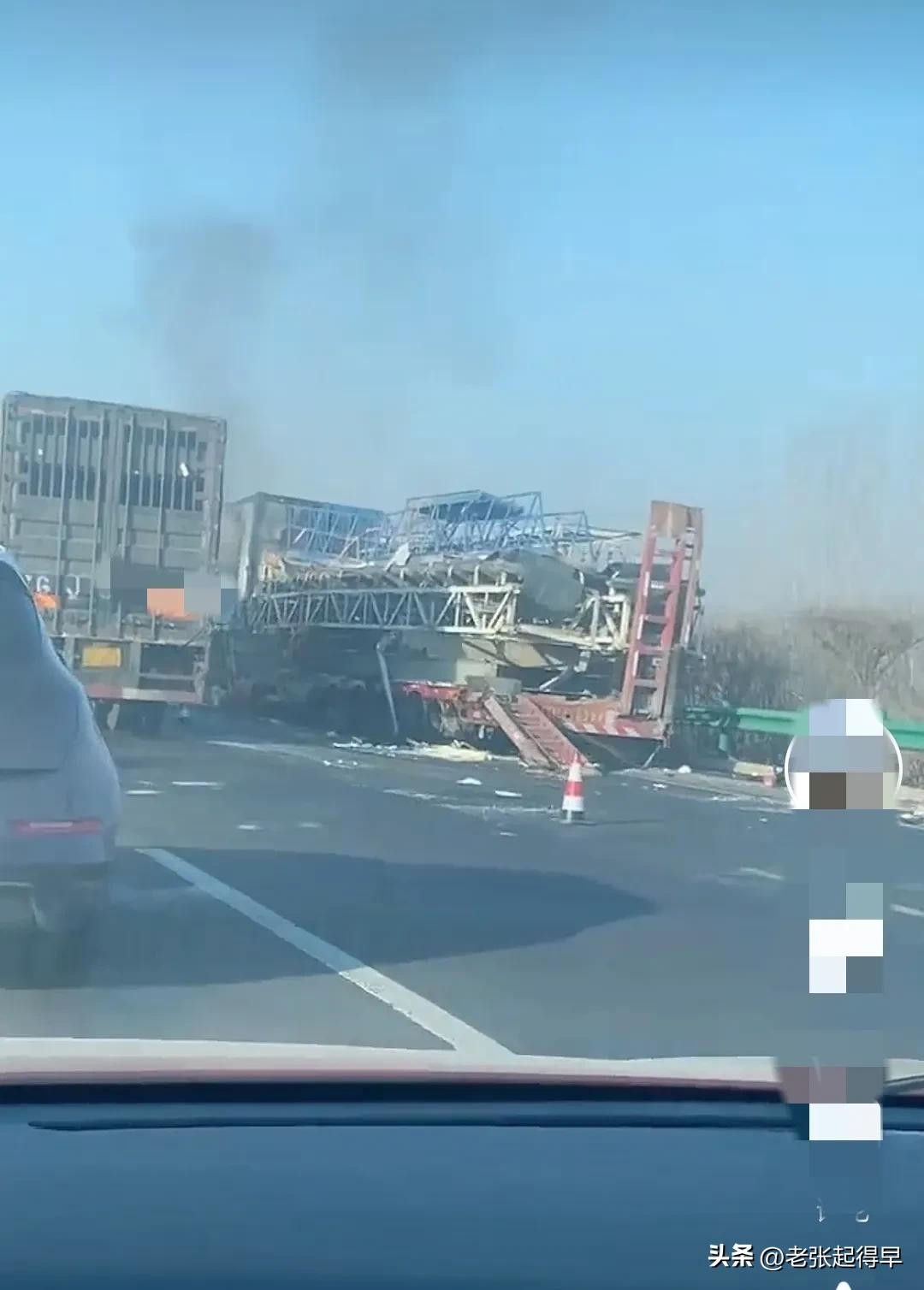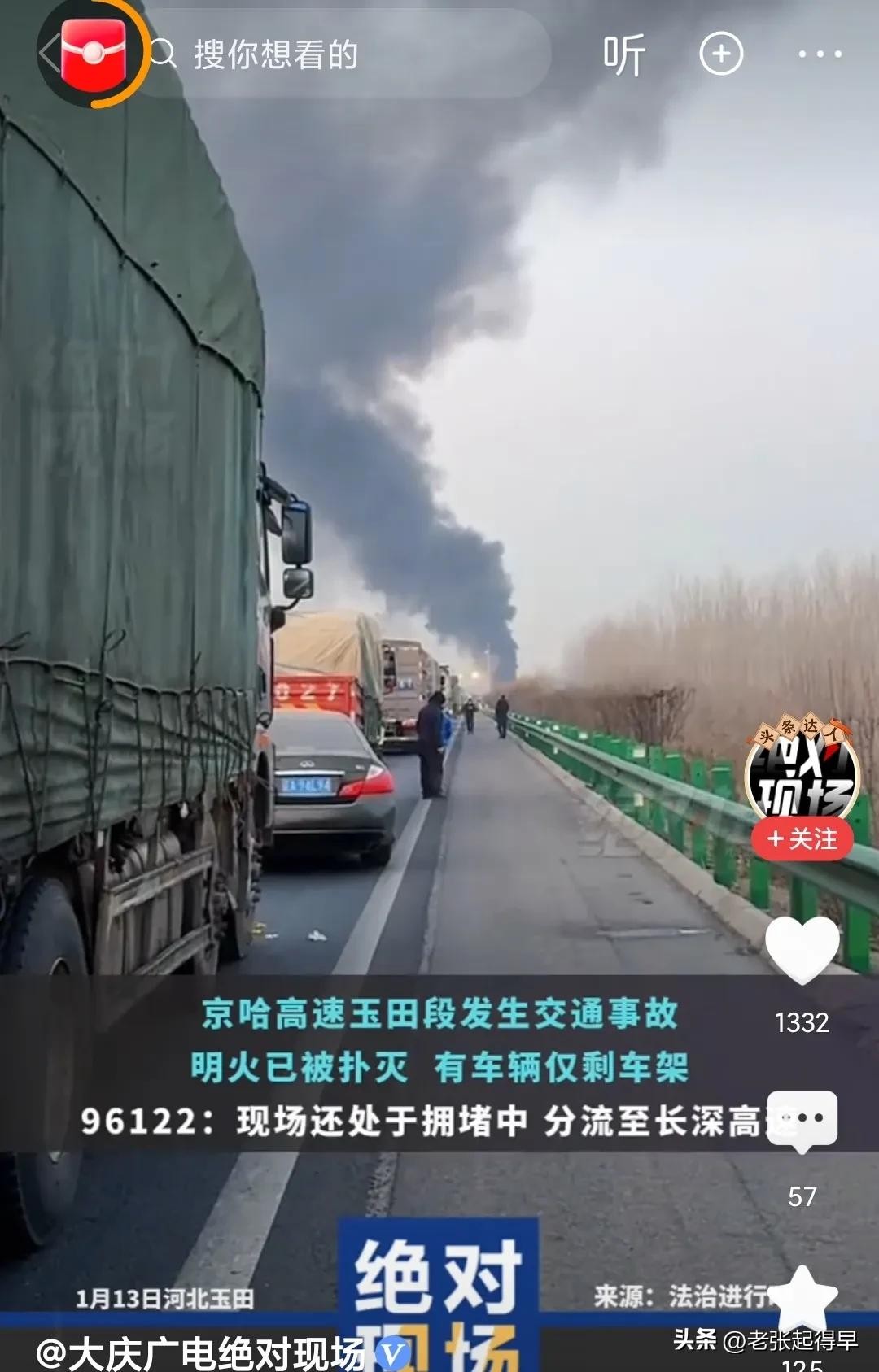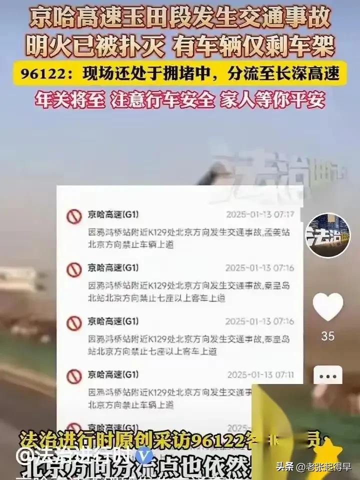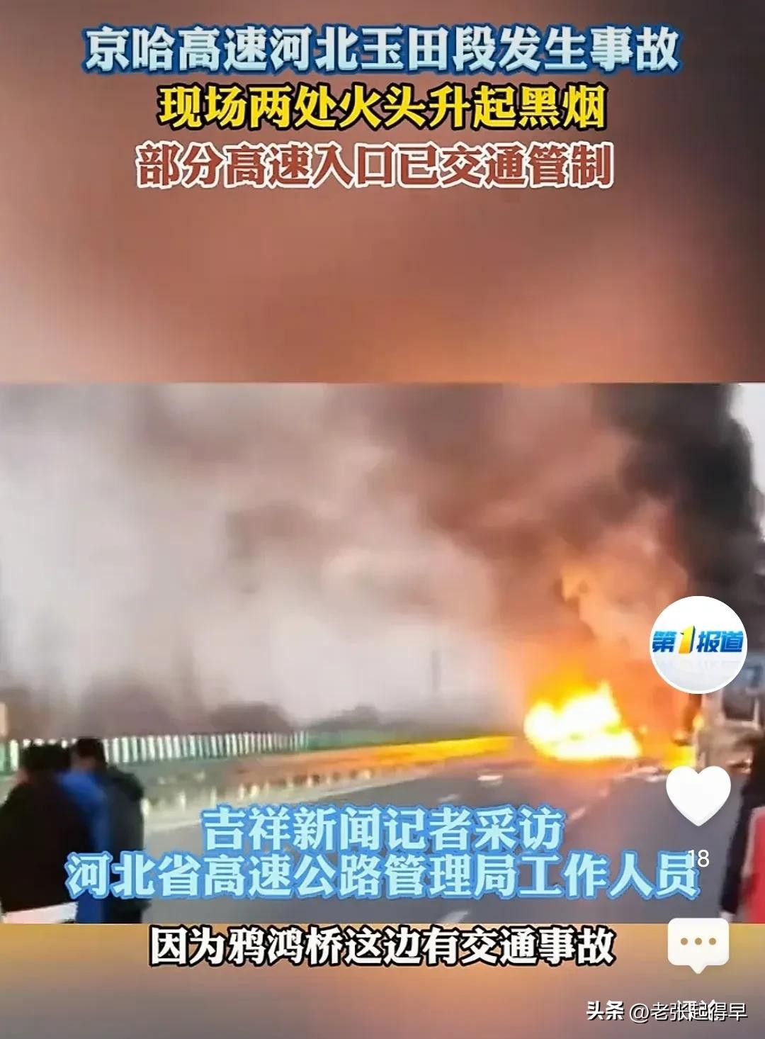 2025年1月13日早上七时许,京哈高速北京方向,河北玉田段鸦鸿桥站附近突发车祸,多辆汽货车发生碰撞,有车辆起火。