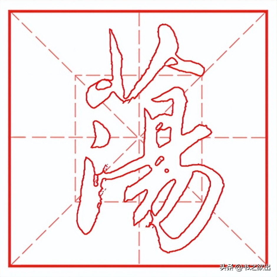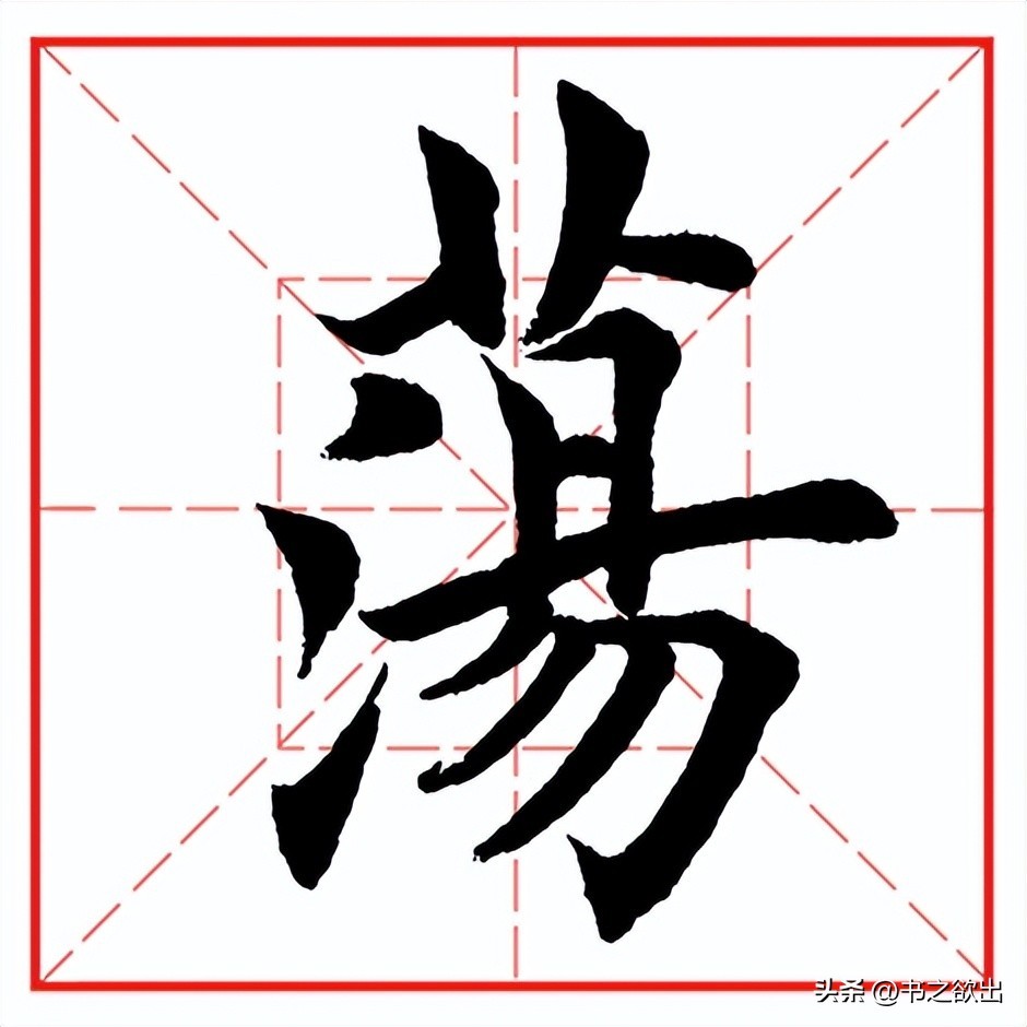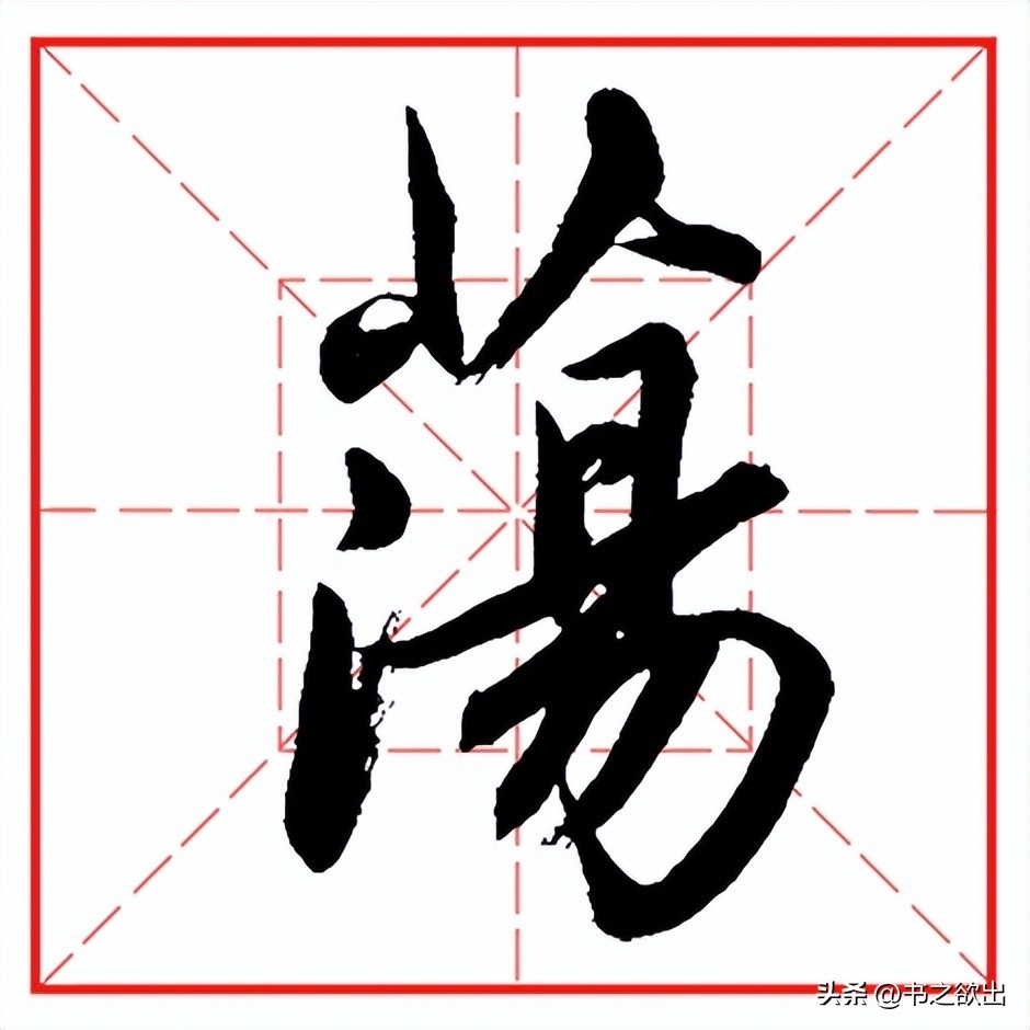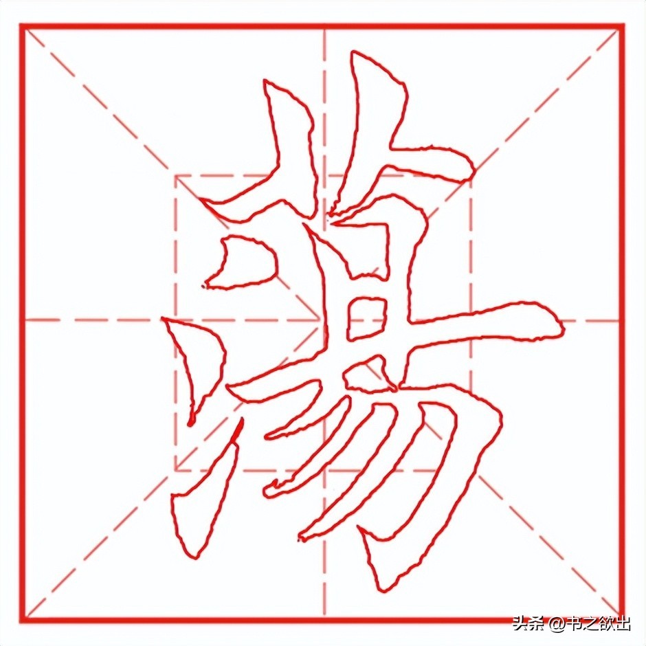 下面“氵”三个点笔笔意相连,首点落笔后顺势稍顿随即向左下方引毫出锋收笔,角度略平,出锋勿长;第二点起笔与首点呼应,距离略近,偏左,起笔后即向左下带,渐轻,带出第三点;第三点的距离稍远,呼应第二点收笔的指向向右下切笔起笔,然后回锋上提,不要写长,注意提笔的指向。